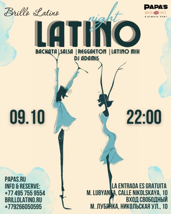09.10.2025 LATINO NIGHT 09.10.25 09.10.2025 09.10.2025 наша LATINO NIGHT в Papa’s Вar Начинаем в 22:00 За пультом DJ ADAMIS Тебя ждет: Латинская музыка и зажигательные ритмы Танцы до утра Атмосфера веселья, дружбы и настоящего латино-духа ВХОД СВОБОДНЫЙ! Акции: уточняй на баре! Адрес: ул. Никольская, д.10! Контакты: +79672038059 Papa’s Bar +79967178551 Алина +79266050595 Екатерина