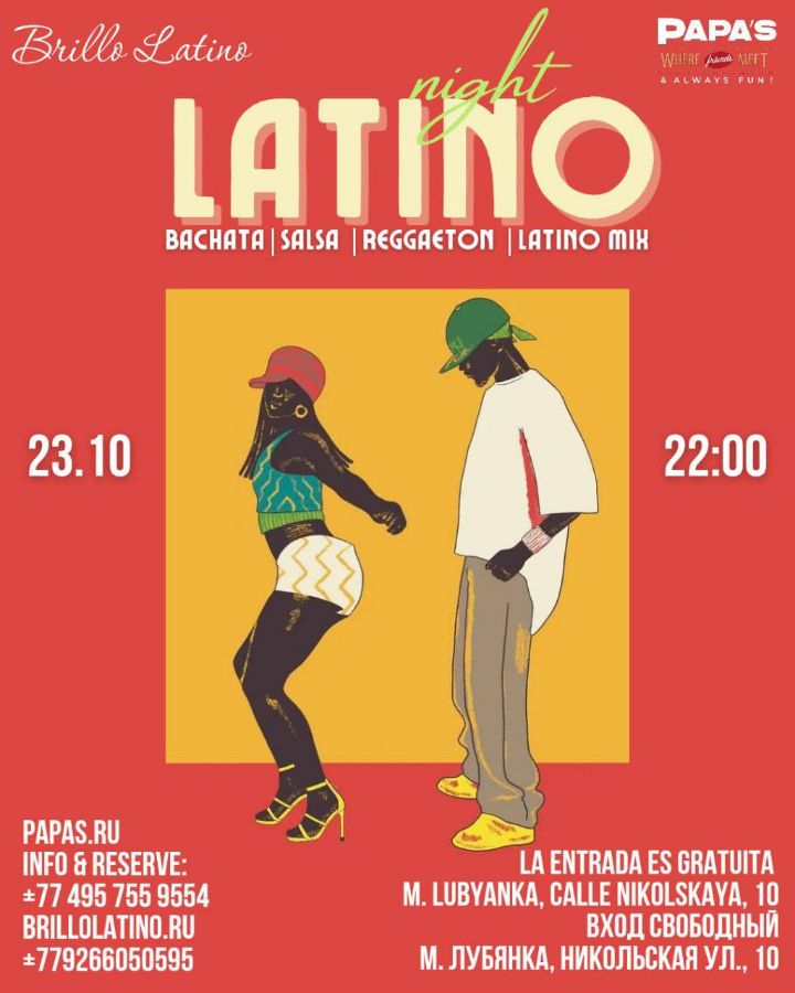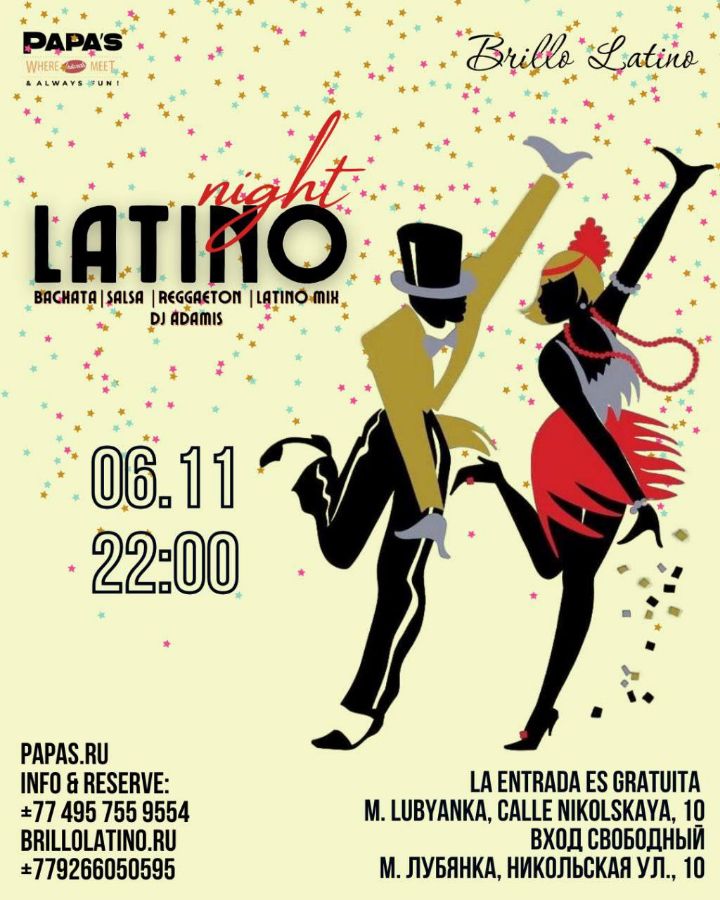 06.11.2025 LATINO NIGHT 06.11.25 06.11.2025 06.11.2025 наша LATINO NIGHT в Papa’s Вar Начинаем в 22:00 За пультом DJ Adamis Тебя ждет: Латинская музыка и зажигательные ритмы Танцы до утра Атмосфера веселья, дружбы и настоящего латино-духа ВХОД СВОБОДНЫЙ! Акции: уточняй на баре! Адрес: ул. Никольская, д.10! Контакты: +79672038059 Papa’s Bar +79967178551 Алина +79266050595 Екатерина