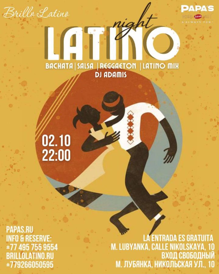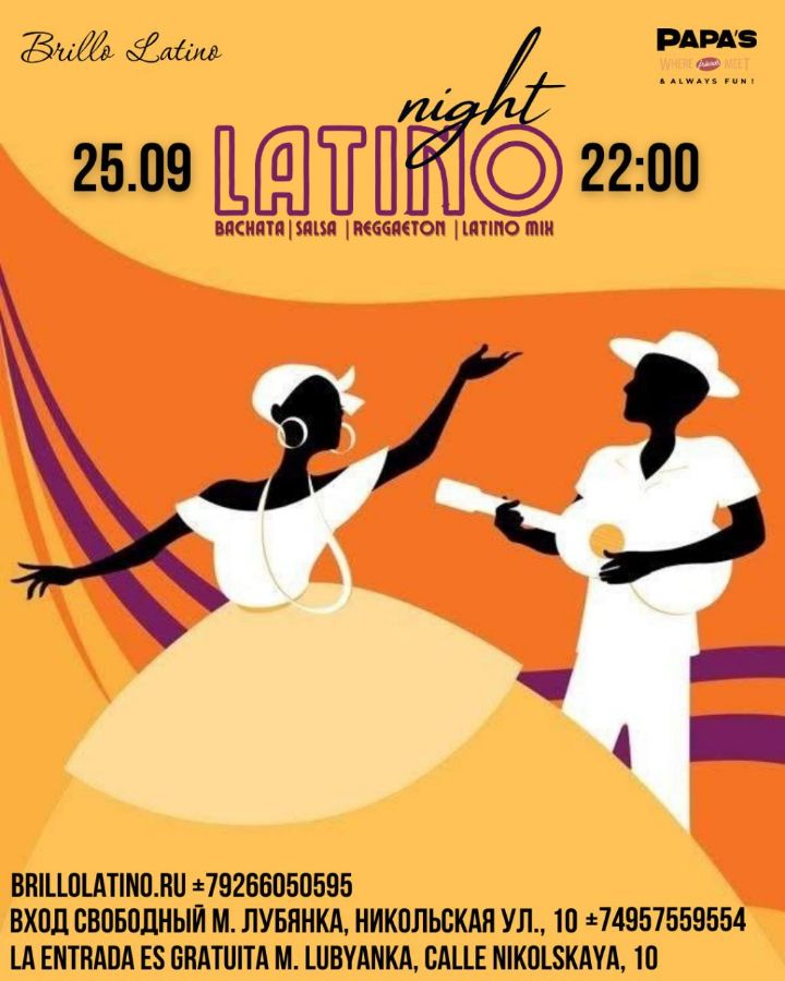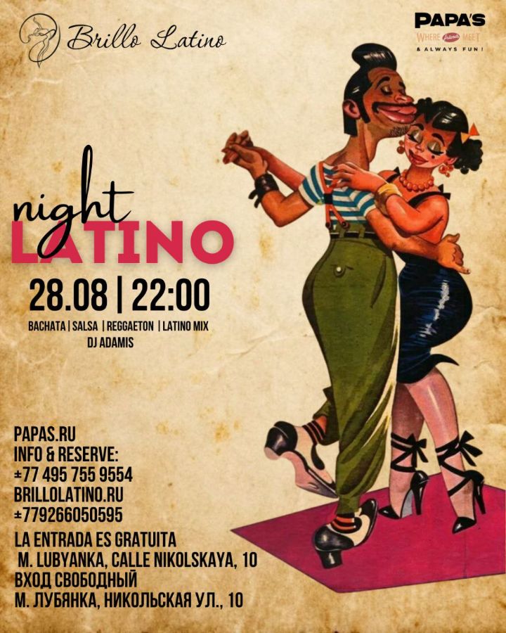 25.09.2025 LATINO NIGHT 25.09.25 25.09.2025 25.09.2025 наша LATINO NIGHT в Papa’s Вar Начинаем в 22:00 За пультом DJ ADAMIS Тебя ждет: Латинская музыка и зажигательные ритмы Танцы до утра Атмосфера веселья, дружбы и настоящего латино-духа ВХОД СВОБОДНЫЙ! Акции: коктейли и пиво 1+1 уточняй на баре! Адрес: ул. Никольская, д.10! Контакты: +79672038059 Papa’s Bar +79967178551 Алина +79266050595 Екатерина