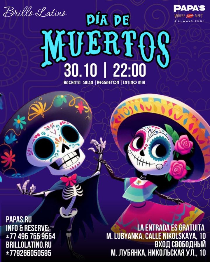 30.10.2025 Dia de muertos 30.10.25 30.10.2025 30.10.2025 Dia de muertos в Papa’s Вar Начинаем в 22:00 За пультом DJ Adamis Тебя ждет: Латинская музыка и зажигательные ритмы Танцы до утра Атмосфера веселья, дружбы и настоящего латино-духа ВХОД СВОБОДНЫЙ! Акции: уточняй на баре! Адрес: ул. Никольская, д.10! Контакты: +79672038059 Papa’s Bar +79967178551 Алина +79266050595 Екатерина