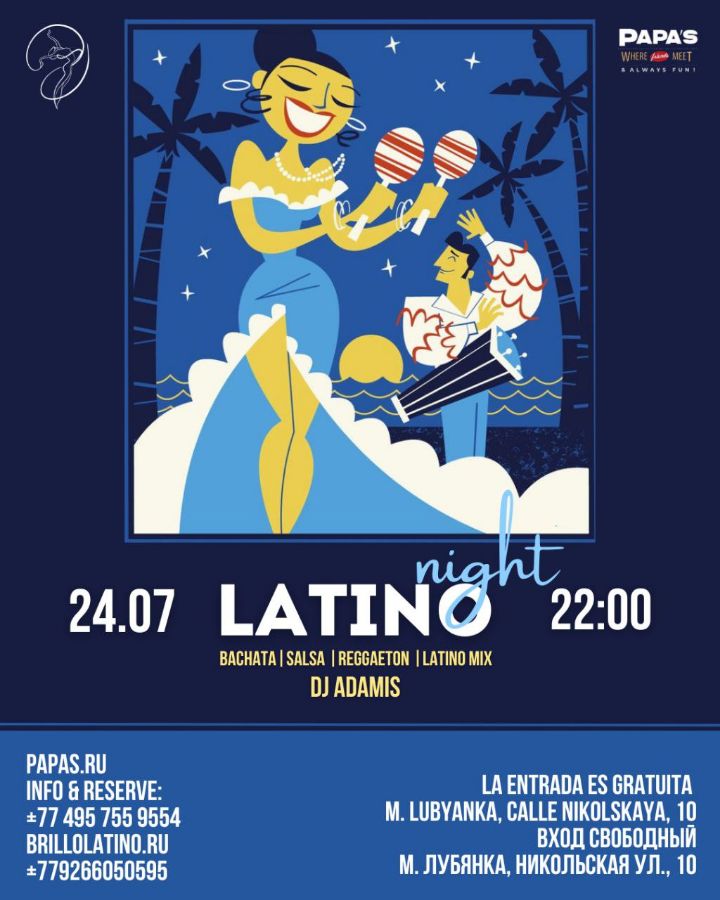 24.07.2025 LATINO NIGHT 24.07.25 24.07.2025 24.07.2025 наша LATINO NIGHT в Papa’s Вar Начинаем в 22:00 За пультом DJ ADAMIS Играют наши любимые бачата, сальса, лучшие реггетон хиты и самые популярные латиноамериканские треки ВХОД СВОБОДНЫЙ! Акции: коктейли и пиво 1+1 Адрес: ул. Никольская, д.10! Контакты: +79672038059 Papa’s Bar +79967178551 Алина +79266050595 Екатерина