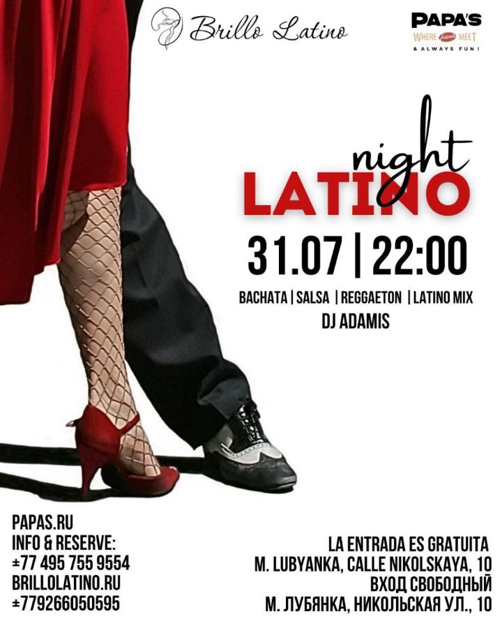 31.07.2025 LATINO NIGHT 31.07.25 31.07.2025 31.07.2025 наша LATINO NIGHT в Papa’s Вar Начинаем в 22:00 За пультом DJ ADAMIS Играют наши любимые бачата, сальса, лучшие реггетон хиты и самые популярные латиноамериканские треки ВХОД СВОБОДНЫЙ! Акции: коктейли и пиво 1+1 Адрес: ул. Никольская, д.10! Контакты: +79672038059 Papa’s Bar +79967178551 Алина +79266050595 Екатерина